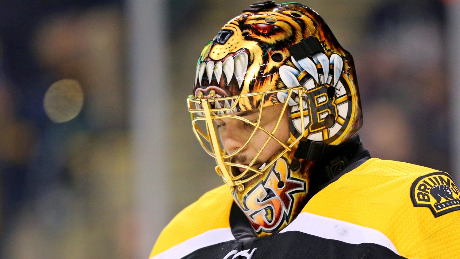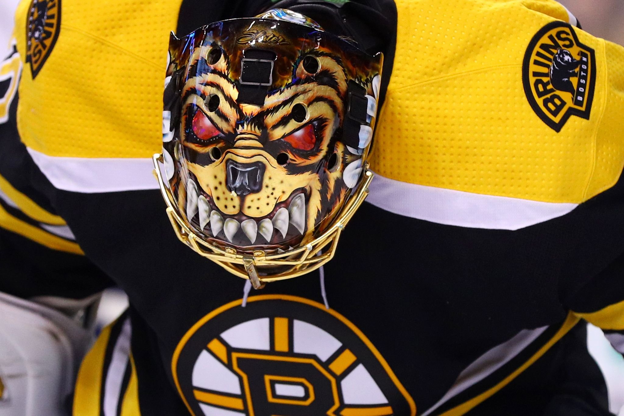 В маске хранителя ворот «Бостона» также использован эффект изменения цвета Sub-Zero: при понижении температуры желтые буквы на белом фоне становятся красными.