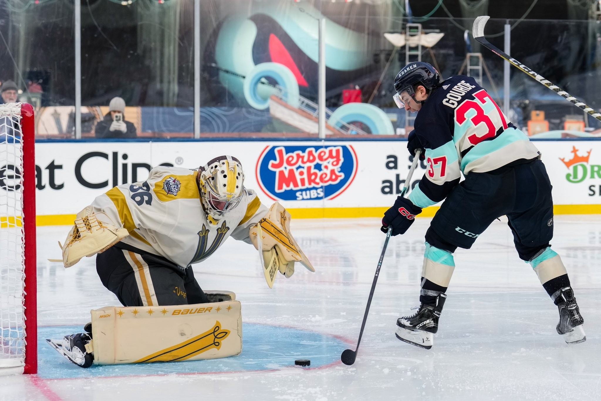 Вратарь «Сиэтла» Джоуи Даккорд отразил все 35 бросков по своим воротам и стал первым голкипером в истории НХЛ, сыгравшим на ноль в «Зимней классике». А один из его сэйвов смело можно назвать одним из самых ярких в текущем сезоне. Лучший бомбардир «Вегаса» Джек Айкел бросил в одно касание, но Даккорд среагировал молниеносно, не дав шайбе залелеть в ворота.